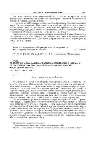 Из отчета члена делегации Крайовой Рады Народовой Я.С. Ханемана об обстоятельствах приезда делегации из Варшавы в Москву и переговорах в Кремле. Не ранее 22 июля 1944 г. // CA KC, PZPR ТО 6942. «U progu Polski Ludowej. Rok 1944». Manuskrypt J.S. Hanemanna. Публикуется по: Документы и материалы по истории советско-польских отношений. Т. VIII: Январь 1944 г. — декабрь 1945 г. М., 1974. С. 162–174. Опубликовано: Haneman J.S. U progu Polski Ludowej // Z pola walki. 1969. № 2. S. 136–150.