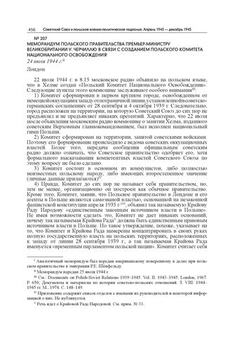 Меморандум Польского правительства премьер-министру Великобритании У. Черчиллю в связи с созданием Польского Комитета Национального Освобождения. 24 июля 1944 г. // Публикуется по: Documents on Polish-Soviet Relations 1939–1945. Vol. II: 1943–1945. London, 1967. P. 293–295. Англ. язык.