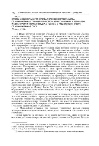 Запись беседы премьер-министра Польского правительства Ст. Миколайчика с премьер-министром Великобритании У. Черчиллем и министром иностранных дел А. Иденом о предстоящем визите Ст. Миколайчика в СССР. 25 июля 1944 г. // Публикуется по: Documents on Polish-Soviet Relations 1939–1945. Vol. II: 1943–1945. London, 1967. P. 298–299. Англ. язык.