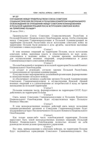 Соглашение между Правительством Союза Советских Социалистических Республик и Польским Комитетом Национального Освобождения об отношениях между советским командованием и польской администрацией после вступления советских войск на территорию Польши. 26 июля 1944 г. // Публикуется по: Документы и материалы по истории советско-польских отношений. Т. VIII: Январь 1944 г. — декабрь 1945 г. М., 1974. С. 153–155. Опубликовано: Известия. 1944. 27 июля; Правда. 1944. 27 июля; Внешняя политика Советского Союза в период Отечественной войны: Документы и материалы: В 3 т. Т. 2: 1 января — 31 декабря 1944 г. М., 1946. С. 157–159; Внешняя политика СССР: Сб. документов: В 6 т. Т. V (июнь 1941 — сентябрь 1945 г.). М., 1947. С. 404–405; Советский Союз — Народная Польша. 1944–1974: Документы и материалы. М., 1974. С. 17–19.