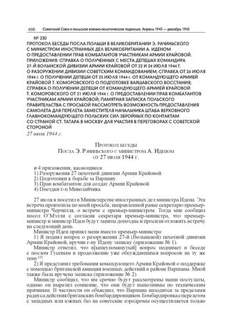 Протокол беседы посла Польши в Великобритании Э. Рачиньского с министром иностранных дел Великобритании А. Иденом о предоставлении прав комбатантов участникам Армии Крайовой. Приложения: справка о полученных с места депешах командира 27-й Волынской дивизии Армии Крайовой от 22 и 24 июля 1944 г. о разоружении дивизии советским командованием; справка от 26 июля 1944 г. о получении депеши от 25 июля 1944 г. от командующего Армией Крайовой Т. Коморовского о подготовке Варшавского восстания; справка о получении депеши от командующего Армией Крайовой Т. Коморовского от 21 июля 1944 г. о предоставлении прав комбатантов участникам Армии Крайовой; памятная записка Польского правительства с просьбой рассмотреть возможность предоставления самолета для перелета заместителя начальника штаба Верховного главнокомандующего Польских Сил Збройных по контактам со страной Ст. Татара в Москву для участия в переговорах с советской стороной. 27 июля 1944 г. // Публикуется по: Armia Krajowa w dokumentach. 1939–1945. T. III: Kwiecień 1943 — lipiec 1944. Wrocław—Warszawa—Kraków, 1991. S. 580–585. Польский язык. Опубликовано: Documents on Polish-Soviet Relations 1939–1945. Vol. II: 1943–1945. London, 1967. P. 302–303. Англ. язык.