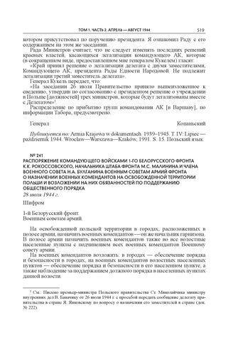 Распоряжение командующего войсками 1-го Белорусского фронта К.К. Рокоссовского, начальника штаба фронта М.С. Малинина и члена Военного совета Н.А. Булганина Военным советам армий фронта о назначении военных комендантов на освобожденной территории ...
