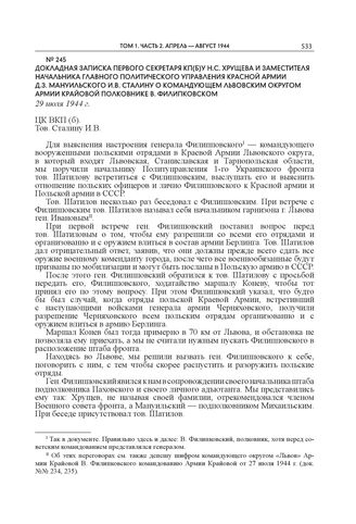Докладная записка первого секретаря КП(б)У Н.С. Хрущева и заместителя начальника Главного политического управления Красной армии Д.З. Мануильского И.В. Сталину о командующем Львовским округом Армии Крайовой полковнике В. Филипковском. 29 июля 1944 г. // АП РФ. Ф. 3. Оп. 66. Д. 65. Л. 197–202. Копия. Машинопись