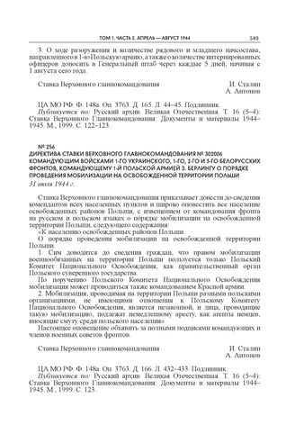 Директива Ставки Верховного главнокомандования № 302006 командующим войсками 1-го Украинского, 1-го, 2-го и 3-го Белорусских фронтов, командующему 1-й Польской армией З. Берлингу о порядке проведения мобилизации на освобожденной территории Польши. 31 июля 1944 г. // ЦА МО РФ. Ф. 148а. Оп. 3763. Д. 166. Л. 432–433. Подлинник. Публикуется по: Русский архив. Великая Отечественная. Т. 16 (5–4): Ставка Верховного Главнокомандования: Документы и материалы 1944–1945. М., 1999. С. 123.