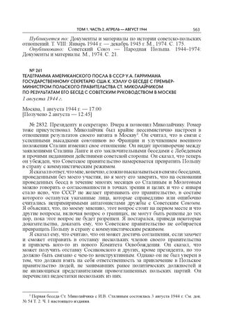 Телеграмма американского посла в СССР У.А. Гарримана государственному секретарю США К. Хэллу о беседе с премьер-министром Польского правительства Ст. Миколайчиком по результатам его бесед с советским руководством в Москве. 1 августа 1944 г. // Публикуется по: FRUS. 1944. Vol. III: The British Commonwealth and Europe. Washington, 1965. P. 1302–1303. Англ. язык.