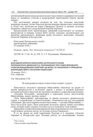 Докладная записка начальника Центрального штаба партизанского движения П.Н. Пономаренко при Ставке Верховного главнокомандования секретарю ЦК ВКП(б) Г.М. Маленкову о принципах взаимодействия с польским подпольем. 20 января 1943 г. // РГАСПИ. Ф. 83. Оп. 1. Д. 28. Л. 3–9. Подлинник. Машинопись.