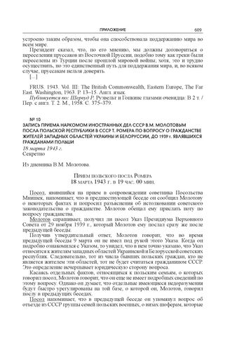 Запись приема наркомом иностранных дел СССР В.М. Молотовым посла Польской Республики в СССР Т. Ромера по вопросу о гражданстве жителей западных областей Украины и Белоруссии, до 1939 г. являвшихся гражданами Польши. 18 марта 1943 г.