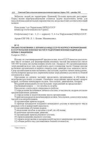 Письмо полковника З. Берлинга в НКВД СССР по вопросу формирования в СССР польских военных частей и подготовки военных кадров для борьбы с фашизмом. 8 апреля 1943 г. // Публикуется по: Документы и материалы по истории советско-польских отношений. Т. VII: 1939–1943 гг. М., 1973. С. 352–353.
