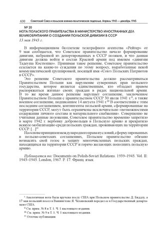 Нота Польского правительства в Министерство иностранных дел Великобритании о создании Польской дивизии в СССР. 13 мая 1943 г. // Публикуется по: Documents on Polish-Soviet Relations. 1939–1945. Vol. II: 1943–1945. London, 1967. P. 17. Франц. язык.