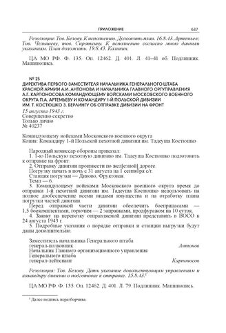 Директива первого заместителя начальника Генерального штаба Красной армии А.И. Антонова и начальника Главного оргуправления А.Г. Карпоносова командующему войсками Московского военного округа П.А. Артемьеву и командиру 1-й Польской дивизии им. Т. Костюшко З. Берлингу об отправке дивизии на фронт. 15 августа 1943 г. // ЦА МО РФ. Ф. 135. Оп. 12462. Д. 401. Л. 79. Подлинник. Машинопись.
