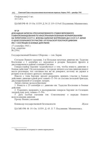 Докладная записка уполномоченного Ставки Верховного главнокомандования по иностранным военным формированиям на территории СССР Г.С. Жукова наркому внутренних дел СССР Л.П. Берии о целесообразности участия 1-й Польской пехотной дивизии им. Т. Костюшко в боевых действиях. 17 сентября 1943 г. // ЦА МО РФ. Ф. 19. Оп. 11539. Д. 43. Л. 7. Подлинник. Машинопись.