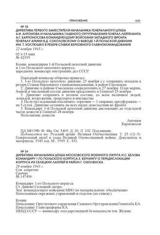 Директива первого заместителя начальника Генерального штаба А.И. Антонова и начальника Главного Оргуправления генерал-лейтенанта А.Г. Карпоносова командующему войсками Западного фронта генералу армии В.Д. Соколовскому о выводе 1-й Польской дивизии им. Т. Костюшко в резерв Ставки Верховного главнокомандования. 22 ноября 1943 г. // ЦА МО РФ. Ф. 48а. Оп. 3409. Д. 20. Л. 102. Подлинник. Публикуется по: Русский архив. Великая Отечественная. Т. 23 (12–3): Генеральный штаб в годы Великой Отечественной войны: Документы и материалы. 1943 год. М., 1999. С. 431.