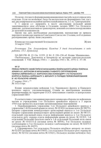 Приказ первого заместителя начальника Генерального штаба генерала армии А.И. Антонова и начальника Главного Оргуправления генерал-лейтенанта А.Г. Карпоносова командиру 1-го Польского корпуса генерал-лейтенанту З. Берлингу о порядке переформирования в 1-ю Польскую армию. 17 марта 1944 г. // ЦА МО РФ. Ф. 48а. Оп. 3410. Д. 9. Л. 180–182. Подлинник. Публикуется по: Русский архив. Великая Отечественная. Т. 23 (12–4): Генеральный штаб в годы Великой Отечественной войны: Документы и материалы. 1944–1945 гг. М., 2001. С. 105–106.