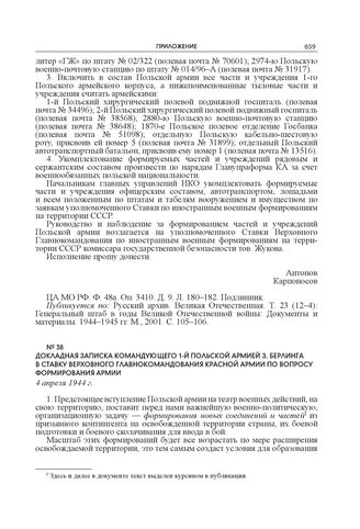 Докладная записка командующего 1-й Польской армией З. Берлинга в Ставку Верховного главнокомандования Красной армии по вопросу формирования армии. 4 апреля 1944 г. // ЦА МО РФ. Ф. 15а. Оп. 450. Д. 1. Л. 110–111. Подлинник. Публикуется по: Документы и материалы по истории советско-польских отношений. Т. VIII: Январь 1944 г. — декабрь 1945 г. М., 1974. С. 100–102.