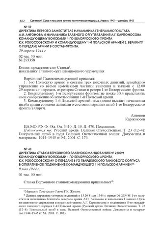 Директива первого заместителя начальника Генерального штаба А.И. Антонова и начальника Главного Оргуправления А.Г. Карпоносова командующему войсками 1-го Белорусского фронта К.К. Рокоссовскому и командующему 1-й Польской армией З. Берлингу о передаче армии в состав фронта. 29 апреля 1944 г. // ЦА МО РФ. Ф. 48а. Оп. 3410. Д. 10. Л. 470. Подлинник. Публикуется по: Русский архив. Великая Отечественная. Т. 23 (12–4): Генеральный штаб в годы Великой Отечественной войны: Документы и материалы. 1944–1945 гг. М., 2001. С. 176.