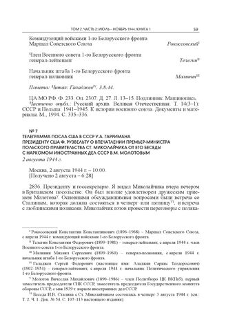 Телеграмма посла США в СССР У.А. Гарримана президенту США Ф. Рузвельту о впечатлении премьер-министра Польского правительства Ст. Миколайчика от его беседы с наркомом иностранных дел СССР В.М. Молотовым. 2 августа 1944 г. // Публ. по: FRUS. 1944. Vol. III: The British Commonwealth and Europe. Washington, 1965. P. 1304. Английский яз.