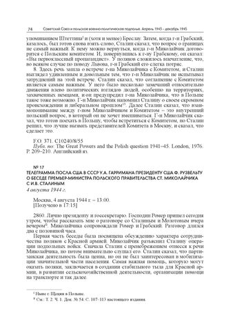 Телеграмма посла США в СССР У.А. Гарримана президенту США Ф. Рузвельту о беседе премьер-министра Польского правительства Ст. Миколайчика с И.В. Сталиным. 4 августа 1944 г. // Публ. по: FRUS. 1944. Vol. III: The British Commonwealth and Europe. Washington, 1965. P. 1305–1306. Английский яз.