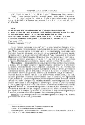 Из записи беседы премьер-министра Польского правительства Ст. Миколайчика с председателем Крайовой Рады Народовой Б. Берутом и председателем ПКНО Э. Осубка-Моравским в присутствии наркома иностранных дел СССР В.М. Молотова о попытках достичь взаимопонимания в создании коалиционного правительства. 8 августа 1944 г. // Публ. по: Documents on Polish-Soviet relations. 1939–1945. Vol. II: 1943–1945. London, 1967. Р. 325–333. Английский яз.