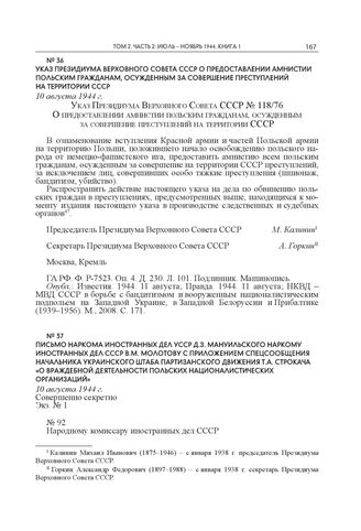 Указ Президиума Верховного Совета СССР о предоставлении амнистии польским гражданам, осужденным за совершение преступлений на территории СССР. 10 августа 1944 г. // ГА РФ. Ф. Р-7523. Оп. 4. Д. 230. Л. 101. Подлинник. Машинопись. Опубл.: Известия. 1944. 11 августа; Правда. 1944. 11 августа; НКВД – МВД СССР в борьбе с бандитизмом и вооруженным националистическим подпольем на Западной Украине, в Западной Белоруссии и Прибалтике (1939–1956). М., 2008. С. 171.