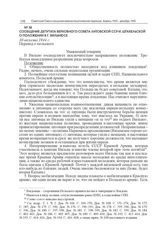Сообщение депутата Верховного Совета Литовской ССР И. Штахельской о положении в г. Вильнюсе. 10 августа 1944 г. // РГАСПИ. Ф. 17. Оп. 128. Д. 766. Л. 11–14. Копия. Машинопись.