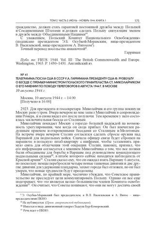 Телеграмма посла США в СССР У.А. Гарримана президенту США Ф. Рузвельту о беседе с премьер-министром Польского правительства Ст. Миколайчиком о его мнении по поводу переговоров 8 августа 1944 г. в Москве. 10 августа 1944 г. // Публ. по: FRUS. 1944. Vol. III: The British Commonwealth and Europe. Washington, 1965. P. 1308–1310. Английский яз.