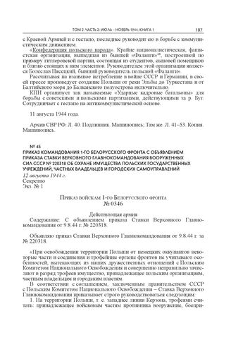 Приказ командования 1-го Белорусского фронта с объявлением приказа Ставки Верховного Главнокомандования Вооруженных сил СССР № 220318 об охране имущества польских государственных учреждений, частных владельцев и городских самоуправлений. 12 августа 1944 г. // ЦА МО РФ. Ф. 233. Оп. 2386. Д. 7. Л. 330–332. Подлинник. Машинопись. Частично опубл.: Wojskowy Przegląd Historyczny. 1968. № 1. S. 356–357; Документы и материалы по истории советско-польских отношений. Т. VIII: Январь 1944 г. – декабрь 1945 г. М., 1974. С. 182–184.