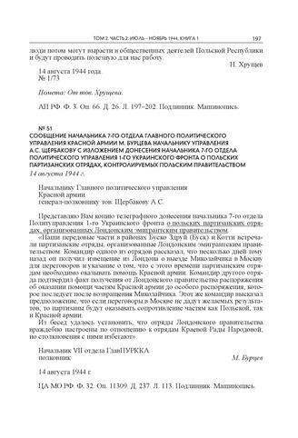 Сообщение начальника 7-го отдела Главного политического управления Красной армии М. Бурцева начальнику Управления А.С. Щербакову с изложением донесения начальника 7-го отдела Политического управления 1-го Украинского фронта о польских партизанских отрядах, контролируемых Польским правительством. 14 августа 1944 г. // ЦА МО РФ. Ф. 32. Оп. 11309. Д. 237. Л. 113. Подлинник. Машинопись.