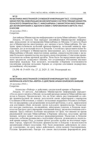 Из Вестника иностранной служебной информации ТАСС. Сообщение Министерства информации Великобритании о встрече премьер-министра Польского правительства Ст. Миколайчика с министром иностранных дел Великобритании А. Иденом в связи с переговорами 8 августа 1944 г. в Москве. 14 августа 1944 г. // ГА РФ. Ф. Р-4459. Оп. 27. Д. 2629. Л. 166. Ротаторный экз.
