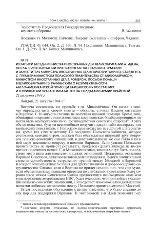 Из записи беседы министра иностранных дел Великобритании А. Идена, посла Великобритании при правительстве Польши О. О’Мэлли и заместителя министра иностранных дел Великобритании О. Сарджента с премьер-министром Польского правительства Ст. Миколайчиком, министром иностранных дел Т. Ромером, послом Польши в Великобритании Э. Рачиньским о неэффективности англо-американской помощи Варшавскому восстанию и о признании права комбатантов за солдатами Армии Крайовой. 21 августа 1944 г. // Публ. по: Documents on Polish-Soviet relations. 1939–1945. Vol. II: 1943–1945. London, 1967. Р. 354–356. Английский яз.