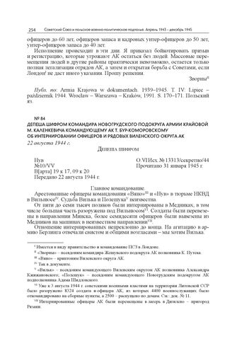 Депеша шифром командира Новогрудского подокруга Армии Крайовой М. Каленкевича командующему АК Т. Бур-Коморовскому об интернировании офицеров и рядовых Виленского округа АК. 22 августа 1944 г.
