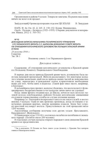 Докладная записка начальника Политического управления 1-го Украинского фронта С.С. Шатилова Военному совету фронта об отношении католического духовенства Польши к Красной армии и ПКНО. 24 августа 1944 г. // ЦА МО РФ. Ф. 236. Оп. 2727. Д. 20. Л. 208–210. Подлинник. Машинопись.