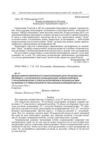 Депеша шифром Верховного главнокомандующего Польских Сил Збройных К. Соснковского командующему Армией Крайовой Т. Бур-Коморовскому о сбросах вооружения и продовольствия на Варшаву и о нежелательности легализации командующего АК. 28 августа 1944 г.