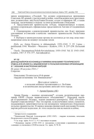 Доклад майоров Коломиеца и Минина начальнику Политического отдела 69-й армии Н.А. Вишневскому о польских военных организациях в г. Люблине и настроении жителей. Не ранее 30 августа 1944 г. // ЦА МО РФ. Ф. 233. Оп. 2374. Д. 26. Л. 124–130. Подлинник. Машинопись.