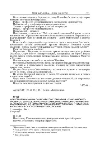 Донесение начальника Политического управления 1-го Украинского фронта С.С. Шатилова начальнику Главного политического управления Красной армии А.С. Щербакову о вражде между польским и украинским населением в освобожденных уездах Польши. 2 сентября 1944 г. // ЦА МО РФ. Ф. 32. Оп. 11289. Д. 589. Л. 30–32. Подлинник. Машинопись.
