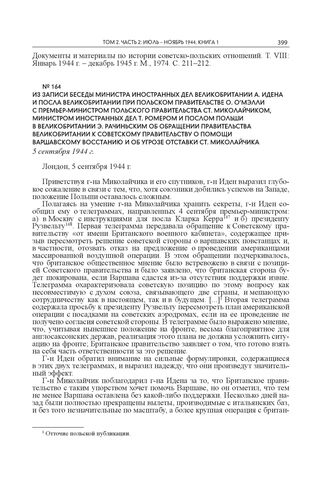Из записи беседы министра иностранных дел Великобритании А. Идена и посла Великобритании при Польском правительстве О. О’Мэлли с премьер-министром Польского правительства Ст. Миколайчиком, министром иностранных дел Т. Ромером и послом Польши в Великобритании Э. Рачиньским об обращении правительства Великобритании к Советскому правительству о помощи Варшавскому восстанию и об угрозе отставки Ст. Миколайчика. 5 сентября 1944 г. // Публ. по: Documents on Polish-Soviet relations. 1939–1945. Vol. II: 1943–1945. London, 1967. Р. 385–387. Английский яз.