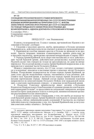 Сообщение уполномоченного Ставки Верховного главнокомандования Вооруженных сил СССР по иностранным военным формированиям на территории СССР Г.С. Жукова заместителю наркома иностранных дел СССР А.Я. Вышинскому по поводу переданного министром иностранных дел Великобритании А. Иденом документа о положении в Польше. 8 сентября 1944 г. // ЦА МО РФ. Ф. 500-А. Оп. 3393. Д. 9. Л. 187–187 об. Заверенная копия. Машинопись. Опубл.: Русский архив. Великая Отечественная. Т. 14(3–1): СССР и Польша: 1941–1945. К истории военного союза. Документы и материалы. М., 1994. С. 351.
