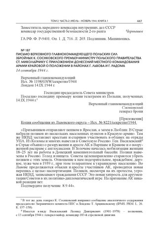 Письмо Верховного главнокомандующего Польских Сил Збройных К. Соснковского премьер-министру Польского правительства Ст. Миколайчику с приложением донесений местного командования Армии Крайовой о положении в районах г. Львова и г. Радома. 14 сентября 1944 г. // IPMS. PRM. L. 7. К. 340–341. Подлинник. Машинопись. Польский яз.