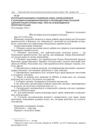 Инструкция командира соединения «Север» Армии Крайовой Я. Борысевича командирам взводов о противодействии польской администрации органам НКВД – НКГБ на освобожденной территории Польши. 20 сентября 1944 г. // ГА РФ. Ф. Р-9478. Оп. 1. Д. 419. Л. 47. Заверенная копия. Машинопись.