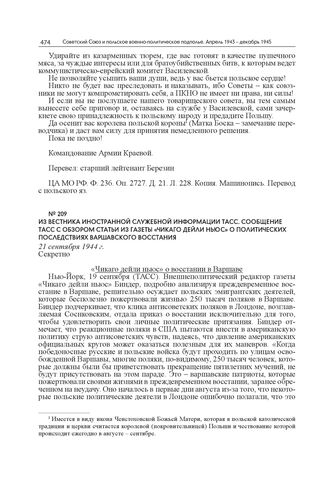 Из Вестника иностранной служебной информации ТАСС. Сообщение ТАСС с обзором статьи из газеты «Чикаго дейли ньюс» о политических последствиях Варшавского восстания. 21 сентября 1944 г. // ГА РФ. Ф. Р-4459. Оп. 27. Д. 3187. Л. 81–82. Ротаторный экз.