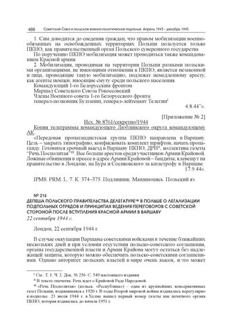 Депеша Польского правительства Делегатуре в Польше о легализации подпольных отрядов и принципах ведения переговоров с советской стороной после вступления Красной армии в Варшаву. 22 сентября 1944 г. // Публ. по: Documents on Polish-Soviet relations. 1939–1945. Vol. II: 1943–1945. London, 1967. Р. 393–394. Английский яз.