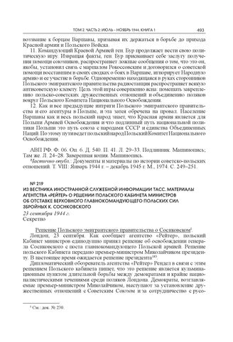 Из Вестника иностранной служебной информации ТАСС. Материалы агентства «Рейтер» о решении польского Кабинета министров об отставке Верховного главнокомандующего Польских Сил Збройных К. Соснковского. 23 сентября 1944 г.