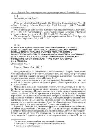 Из записи беседы премьер-министра Великобритании У. Черчилля, заместителя премьер-министра К. Эттли и посла Великобритании при правительстве Польши О. О’Мэлли с премьер-министром Польского правительства Ст. Миколайчиком, министром иностранных дел Т. Ромером и послом Польши в Великобритании Э. Рачиньским о поддержке восстания в Варшаве и трудностях переговоров с И.В. Сталином. 29 сентября 1944 г. // Публ. по: Documents on Polish-Soviet relations. 1939–1945. Vol. II: 1943–1945. London, 1967. Р. 395–398. Английский яз.