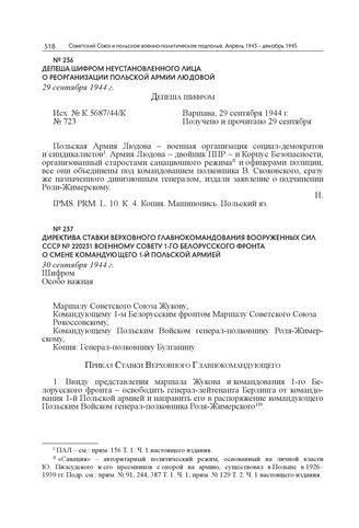 Директива Ставки Верховного главнокомандования Вооруженных сил СССР № 220231 Военному совету 1-го Белорусского фронта о смене командующего 1-й Польской армией. 30 сентября 1944 г. // ЦА МО. Ф. 148а. Оп. 3763. Д. 167. Л. 66. Отпуск. Рукопись. Частично опубл.: Русский архив. Великая Отечественная. Т. 16(5–4): Ставка Верховного Главнокомандования: Документы и материалы 1944–1945. М., 1999. С. 152.