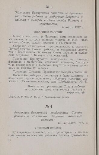 Обращение Бахмутского комитета по организации Совета рабочих и солдатских депутатов к рабочим о выборах в Совет города Бахмута и окрестностей. 6 март 1917 г. // СОГА, ф. Р-1463, д. 43, л. 1. Типографский оттиск.