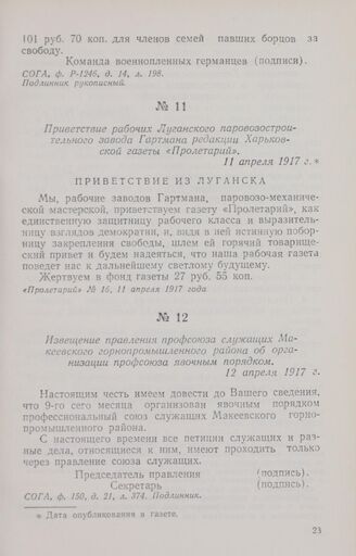 Извещение правления профсоюза служащих Макеевского горнопромышленного района об организации профсоюза явочным порядком. 12 апреля 1917 г. // СОГА, ф. 150, д. 21, л. 374. Подлинник.