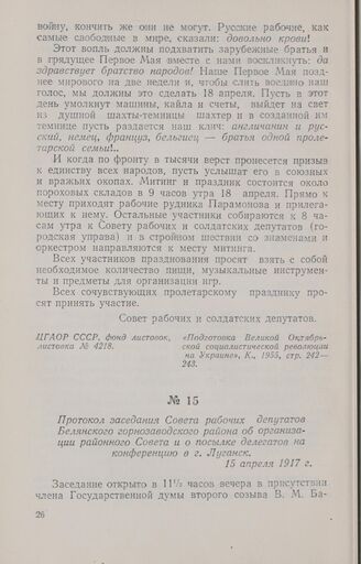 Протокол заседания Совета рабочих депутатов Белянского горнозаводского района об организации районного Совета и о посылке делегатов на конференцию в г. Луганск. 15 апреля 1917 г.