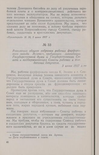 Резолюция общего собрания рабочих фарфорового завода Эссена, требующая ликвидации Государственной думы и Государственного Совета и поддерживающая Советы рабочих и солдатских депутатов. 3 июня 1917 г.