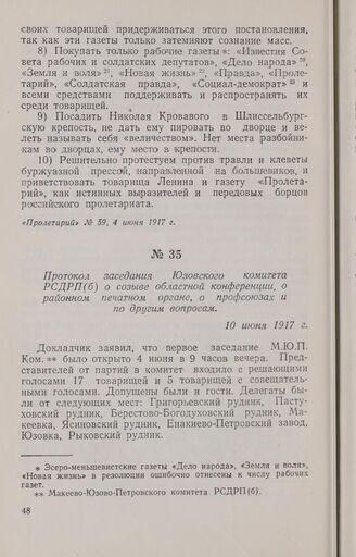 Протокол заседания Юзовского комитета РСДРП(б) о созыве областной конференции, о районном печатном органе, о профсоюзах и по другим вопросам. 10 июня 1917 г. // Архив Укр. филиала ИМЛ при ЦК КПСС, ф. 33, oп. 1, д. 1, л. 4—5. Подлинник.