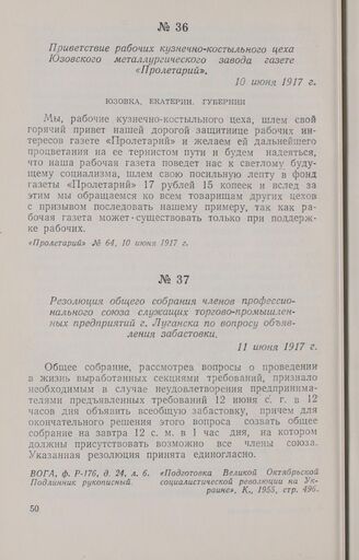 Резолюция общего собрания членов профессионального союза служащих торгово-промышленных предприятий г. Луганска по вопросу объявления забастовки. 11 июня 1917 г. // ВОГА, ф. Р-176, д. 24, л. 6. Подлинник рукописный. «Подготовка Великой Октябрьской социалистической революции на Украине», К., 1955, стр. 496.