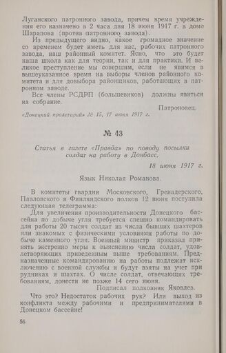 Статья в газете «Правда» по поводу посылки солдат на работу в Донбасс. 18 июня 1917 г.